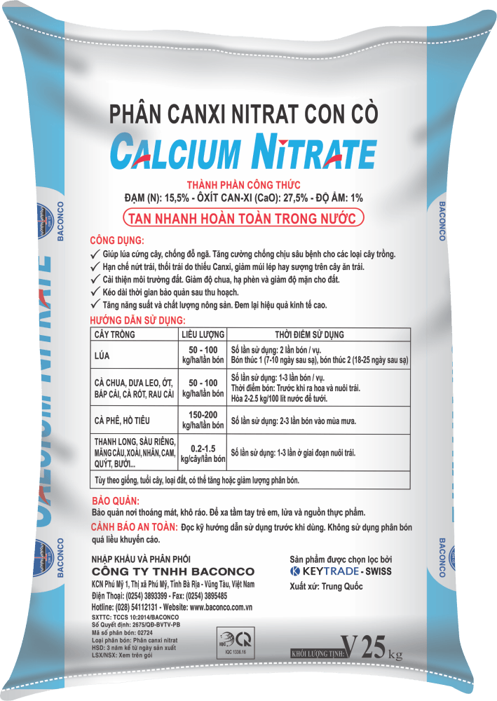 CON CÒ CALCIUM NITRATE là phân Canxi Nitrat cung cấp đồng thời Canxi (Ca) và Đạm Nitrat (NO3-) giúp cây hấp thu nhanh, phát triển rễ mạnh, lá xanh bền và tăng sức chống chịu. Sản phẩm hỗ trợ hạn chế nứt trái, thối trái, rụng hoa – rụng trái non, tăng chất lượng nông sản, phù hợp cho rau màu, cây ăn trái, cây công nghiệp và cây trồng giá trị cao.